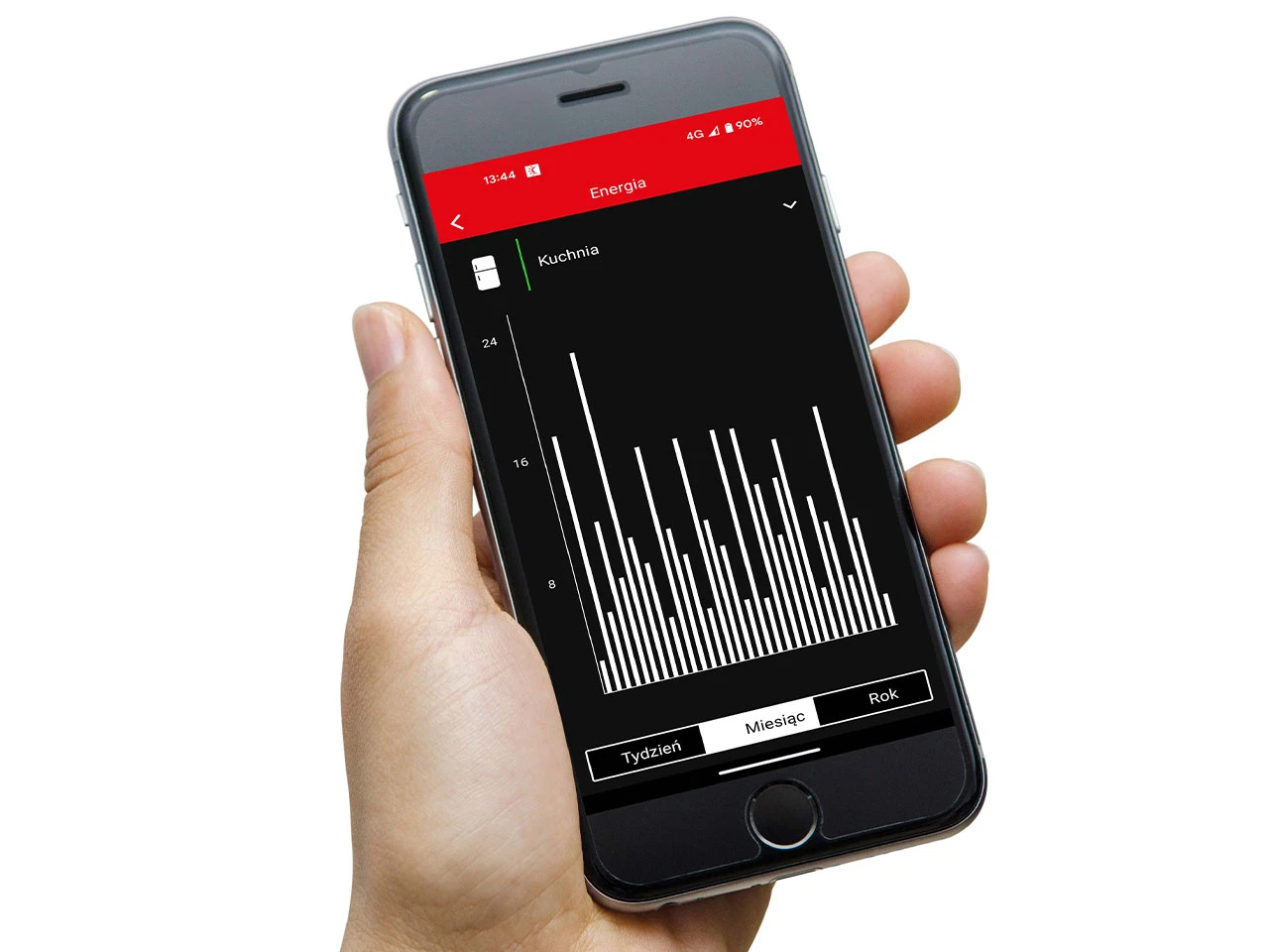 - Kontrola zużycia energii – pokazuje zużycie energii elektrycznej za ostatni tydzień, miesiąc i rok.